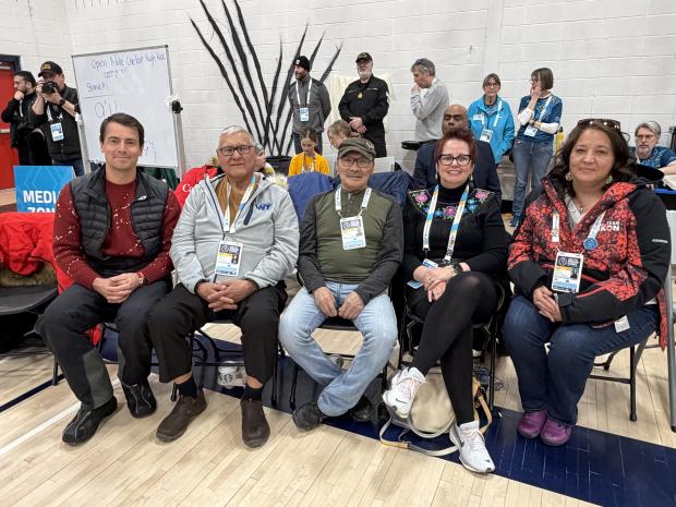 ISCNWT Award Dinner 2025. Indigenous Sport Circle NWT 2025 Awards, From left to right: Sarah & Davy Krengnektak of Tuktoyaktuk for the Language & Culture Award; Lynda MacCauley of Norman Wells for the Community Builder Award; Kathy Brown, Rex Turner for the Sport Award; Giovanni Akeson of Chief Jimmy Bruneau School, Behchoko for the Teachers Association Award; Neilson Vandell of Fort Providence for the Coach Award; The Hon. Gerald W. Kisoun, Commissioner of the Northwest Territories.
